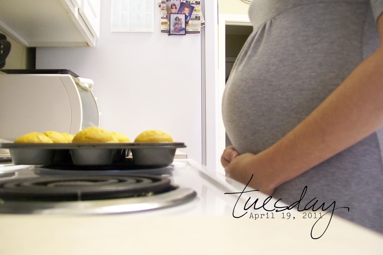 Around here... our ovens are full. In fact, today I'll be baking banana muffins since all of my muffins from the baking day pictured are almost gone. I keep twelve in the cake stand and the rest in the fridge in an air tight container. When the muffins start to run low, I just replenish. As for my little oven, it is bulging nicely. I haven't taken nearly as many belly pictures this time around as I did with Addie, but I'm okay with that :)